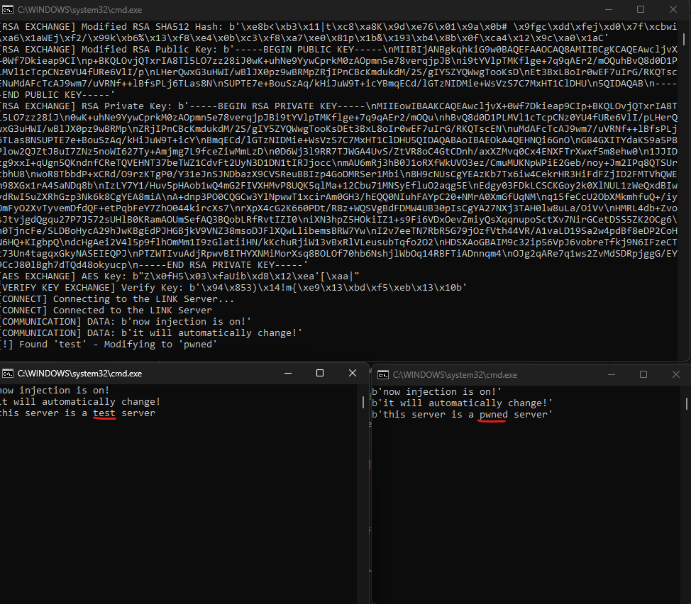 The MITM test to automatically modify b'test' to b'pwned' was successfully conducted.