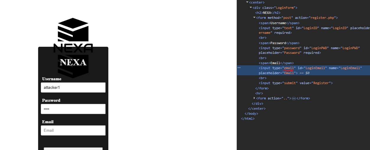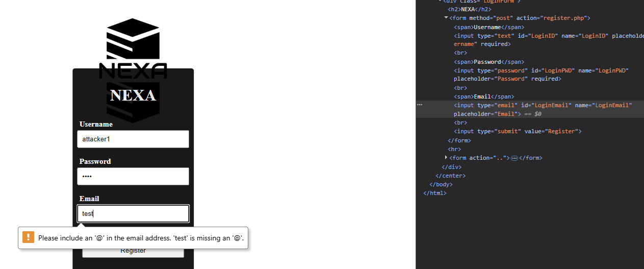 Currently, the account registration page uses an <input type="email" ... > field for the email. This is a very basic form of filtering, which can be easily bypassed by tampering with the input type on the client side. We will investigate whether the server has any additional filtering mechanisms for the email field.